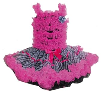A hotpink zebra pattern all ruffle pettidress. It has a soft tulle. The ruffles go all around the skirt and on the front of the dress.